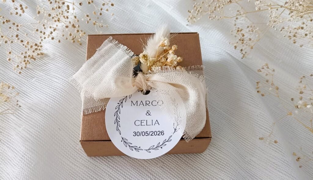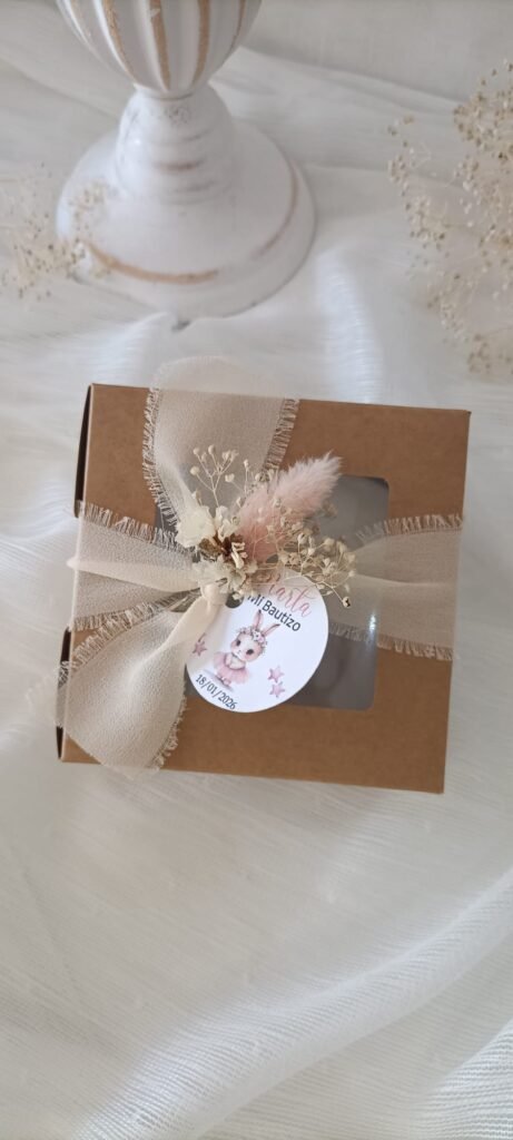 | Presentación | Con bolsa de organza, Con bolsa de organza y etiqueta, Con caja kraft, cuerda de rafía y etiqueta, Con caja kraft, lazo deshilachado y etiqueta, Con caja kraft, lazo deshilachado, etiqueta y ramillete de flores |