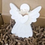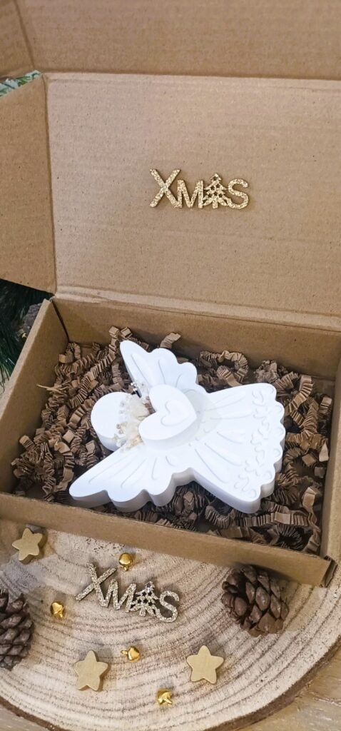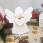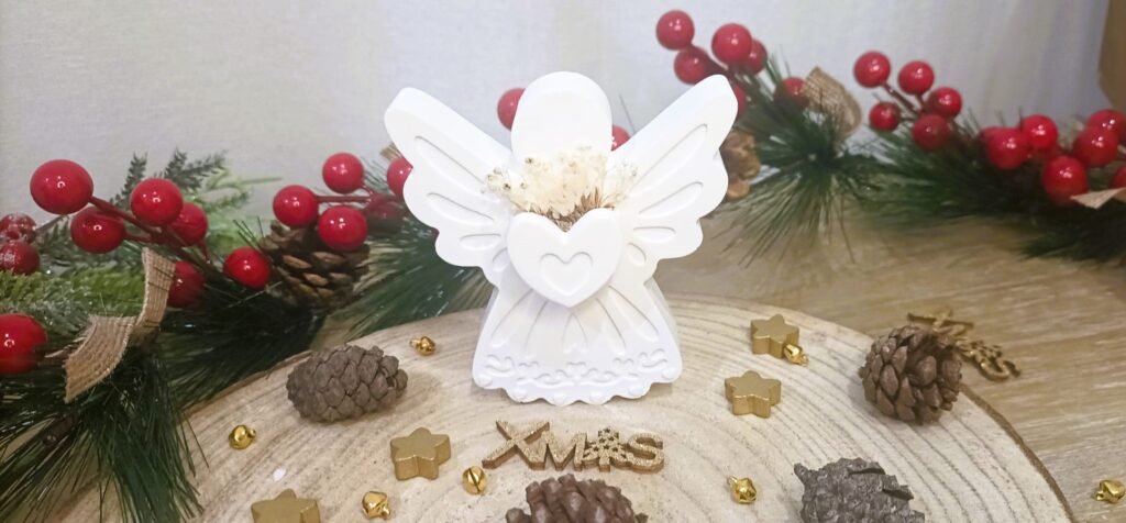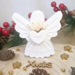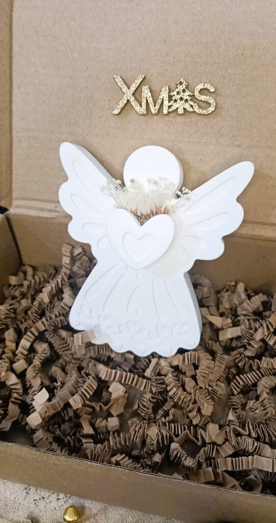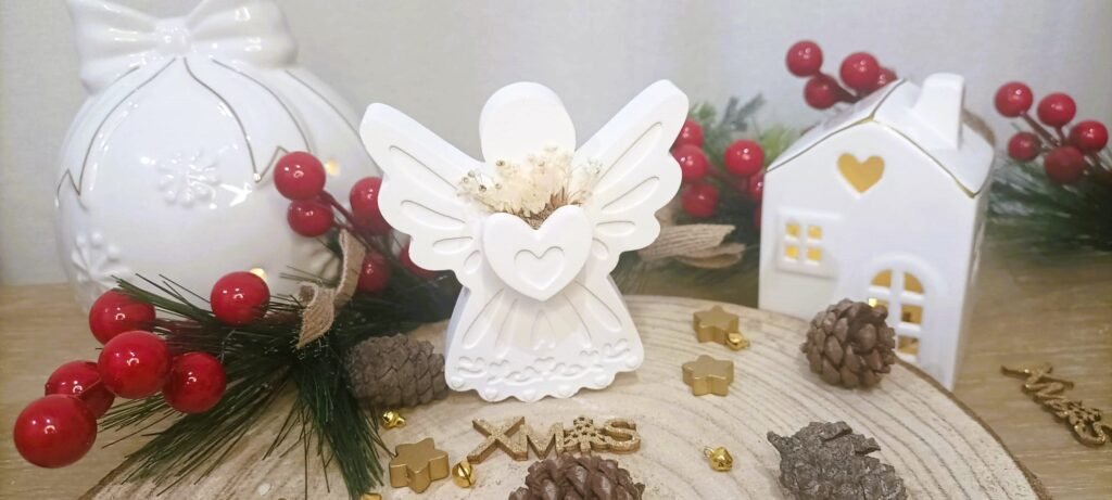 Este hermoso ángel hecho a mano es un detalle ideal para regalar en estas fechas navideñas. Su diseño delicado incluye un corazón en relieve y pequeñas flores secas que aportan un toque natural y encantador.