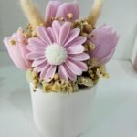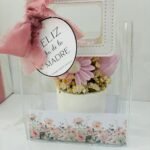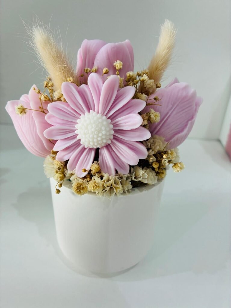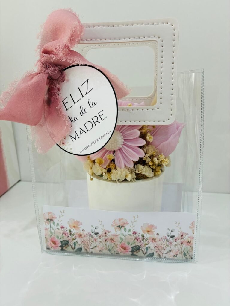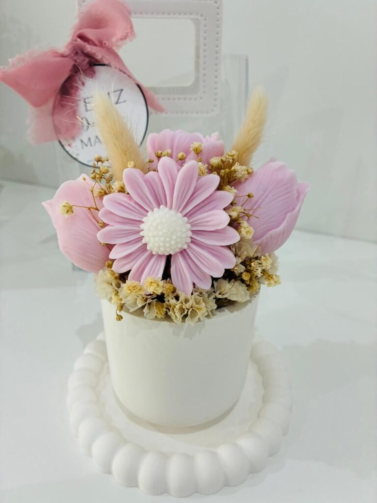 Macetero artesanal elaborado con delicadeza, decorado con elegantes flores preservadas que mantienen su belleza con el paso del tiempo, acompañado de originales velas en forma de flor que aportan un toque cálido y especial. Un detalle único y lleno de encanto, ideal para regalar en el Día de la Madre o en celebraciones tan importantes como bodas, comuniones y bautizos.