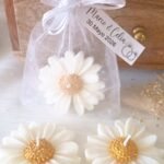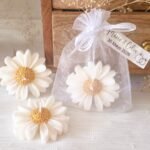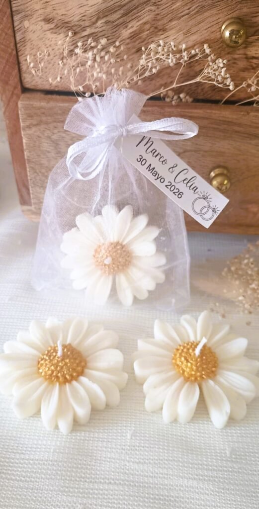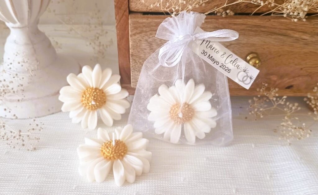 Delicada vela artesanal en forma de margarita, elaborada con cera de soja 100% natural y pintada a mano una a una, con un encantador centro dorado que la hace única. Disponible con el aroma que tú elijas, aporta elegancia, frescura y calidez a cualquier espacio.