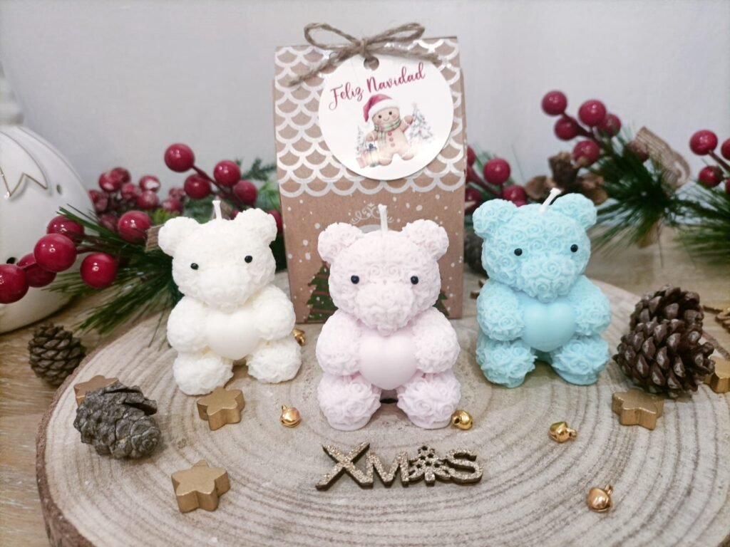Dale un toque mágico a tu Navidad con nuestra vela de oso labrado con rosas, ¡lista para regalar en su hermosa caja festiva!
