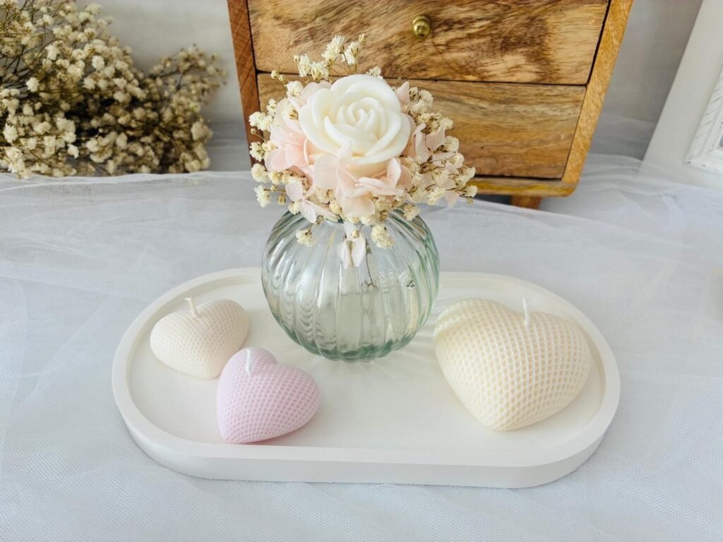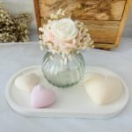 Celebra el amor con un pack pensado para emocionar y decorar cualquier espacio. Incluye una bandeja con velas en forma de corazón, perfectas para crear un ambiente romántico, y un elegante jarrón con flores preservadas que mantienen su belleza con el tiempo. En el centro del jarrón, una delicada vela en forma de rosa sin mecha aporta un toque sofisticado y romántico.