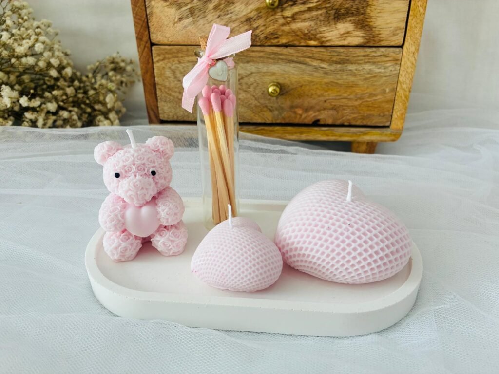 Sorprende con un detalle especial y lleno de encanto. Este pack de San Valentín incluye una elegante bandeja con un adorable osito decorativo, dos corazones elaborados con cera de soja natural y un bote con las exclusivas Cerillas del Amor, perfectas para crear un ambiente cálido y romántico.