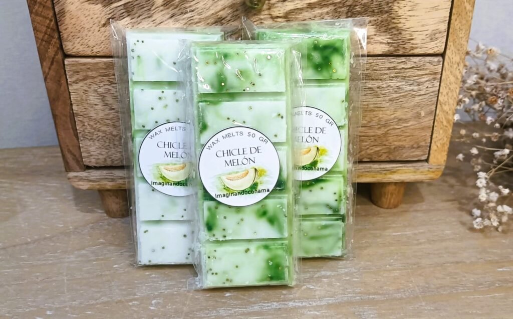 Tableta de cera artesanal – Chicle de Melón: estas tabletas de wax recuerdan el aroma del chicle de melón, transportándote a momentos de infancia llenos de dulzura. Con notas de sandía jugosa y cítricos refrescantes, hechas con cera de soja 100% vegetal y toques aromáticos de alta calidad.