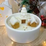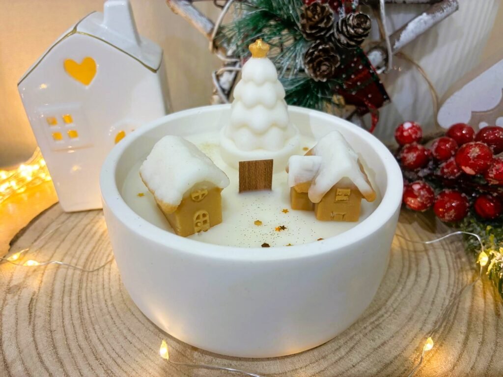 La Vela Poblado Navideño está elaborada artesanalmente con 200 gramos de cera de soja natural y presentada en un recipiente artesanal decorado con encantadoras casitas y un árbol de Navidad, evocando la magia de un pequeño pueblo en plena época navideña.