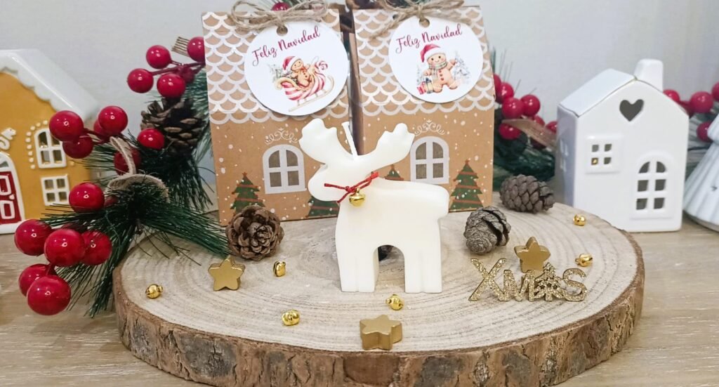 Vela artesanal de cera de soja en forma de reno, ideal para decorar y regalar esta Navidad.