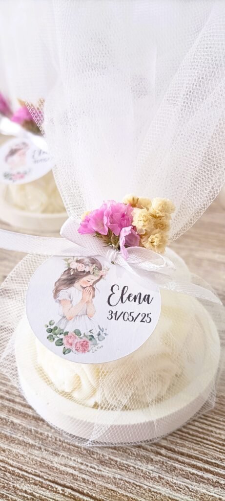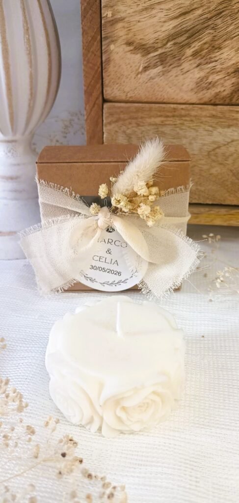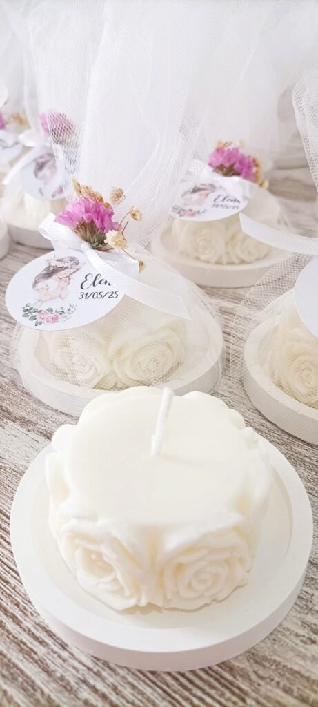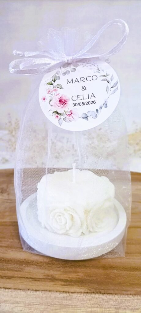 | Presentación | Vela con platillo, tul, etiqueta y mini ramillete de flores, Vela con platillo en caja, Vela en caja ( sin platillo ), Vela con platillo en caja, con lazo deshilachado beig, etiqueta y ramillete de flores, Con bolsa de organza y etiqueta |
